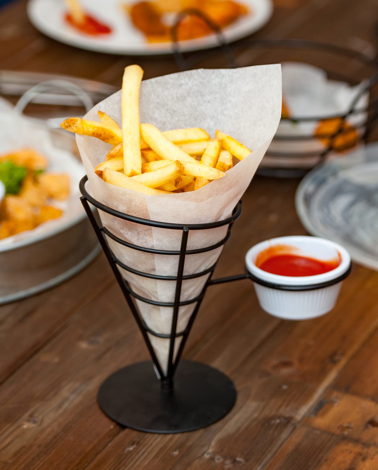 French fry cones are, of course, great for French and sweet potato fries… but why not use them for nuggets, calamari, or mozzarella sticks? And despite their fairly specific name, taco holders are also perfect for serving hot dogs, fajitas, burritos, sausage rolls, desserts, and so much more. And it should go without saying – serving platters are great for serving platters!
